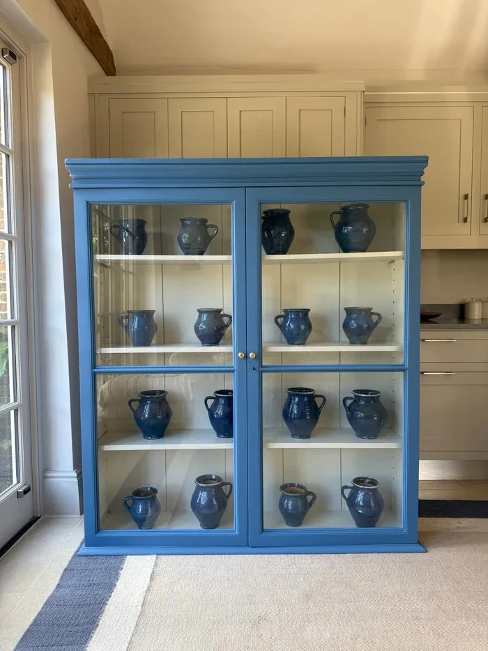 A large painted pine glazed cabinet dating from the early 20th century, featuring its original aged glass panes. Fully restored and finished in Farrow & Ball’s striking Ultra Marine Blue, it combines vintage charm with a fresh, contemporary colour. Inside, three adjustable-height shelves provide versatile storage, making it both a practical and stylish addition to any room.