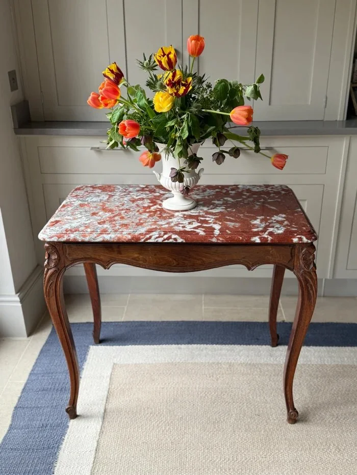 A Louis XV walnut console featuring a rich Rouge Languedoc marble top, full of character and elegance. The piece includes a discreet, hidden drawer, combining style with practical storage. Its graceful lines and warm walnut tones make it a timeless addition to any hallway or living space. Its exquisite craftsmanship and classic proportions ensure it remains a standout piece while effortlessly complementing both traditional and contemporary interiors.