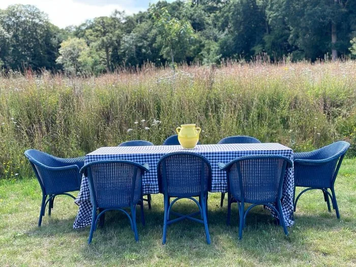 A beautiful vintage set of Lloyd Loom ‘Lusty’ chairs, fully restored and repainted in Farrow & Ball’s Hague Blue. This set of eight includes three side chairs and five armchairs, offering a stylish and cohesive seating arrangement. We can also create a custom set of cushions in our classic blue-and-white ticking, or in a fabric of your choice, to perfectly complement the chairs and your interior scheme.