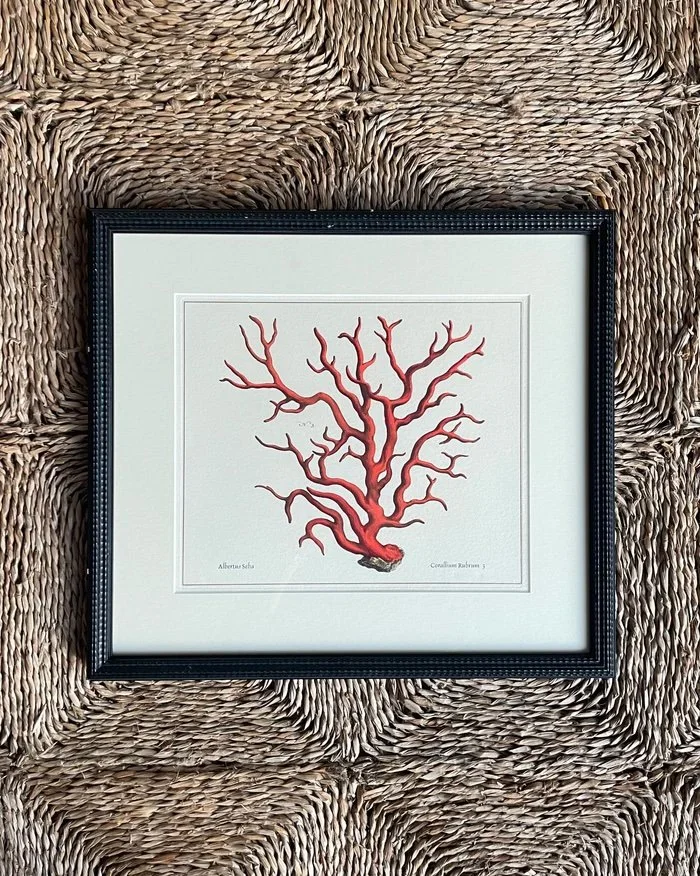 A beautifully framed red coral print, presented in an off-black textured frame that adds depth and contrast. The vibrant coral tones sit elegantly against the darker surround, creating a piece that feels both refined and quietly striking, perfect for adding a touch of coastal elegance to any room.