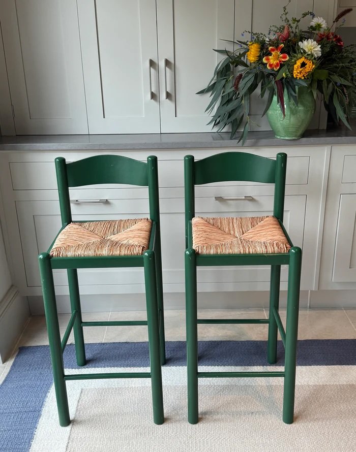 A pair of green-painted barstools with handwoven rush seats, offering a delightful pop of colour. The sleek painted frames contrast beautifully with the rustic texture of the seats, creating a charming mix of contemporary and traditional elements, perfect for adding character and warmth to a kitchen or bar area.